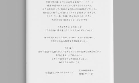 ブランド2つのふんどしブランドを展開する(有)プラスチャーミングは、2月14日に向けて以下のメッセージを表明しました。全文ご紹介いたします。 2月14日は特別な記念日です。 日本では、女性から男性へ愛を込めてチョコレートを贈るこ…
