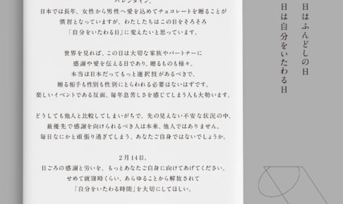 2月14日を「自分をいたわる日」に変えませんか? バレンタイン。 日本では長年、女性から男性へ愛を込めてチョコレートを贈ることが慣習となっていますが、わたしたちはこの日をそろそろ「自分をいたわる日」に変えた…